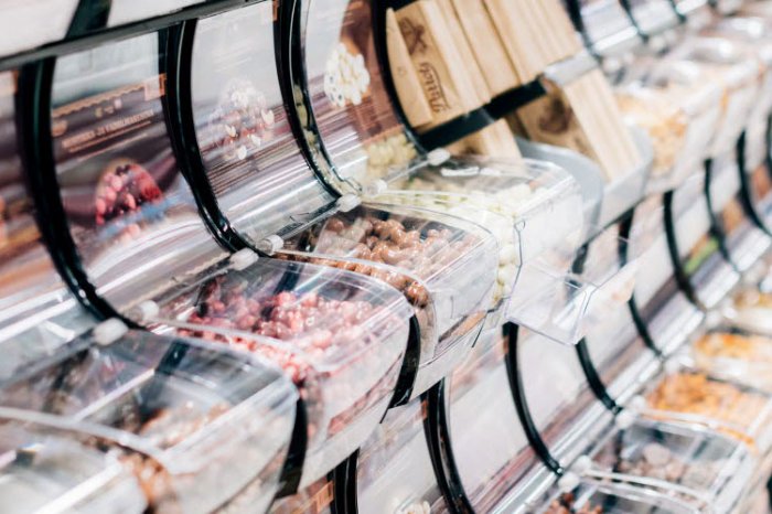 Натуральные снеки, например орехи, все чаще предлагаются вразвес, а не в заранее упакованных коробках или пакетах. Прозрачные емкости с совком и гравитационные емкости помогают создать видимость и изобилие, а также сократить время, которое тратится на пополнение запаса товара.