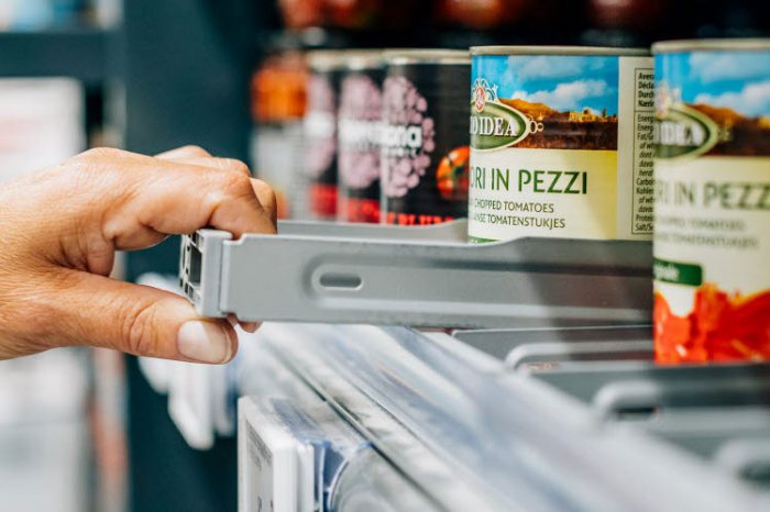Каждый ряд бутылок или банок помещается в регулируемую по ширине стальную рамку, скрытую за фронтальным ограничителем. Рамки помещаются прямо на полку и могут использоваться в любом положении. Для фронтального размещения товаров поднимите рамку из-за ограничителя, потяните ее перед, переместив товары к лицевой стороне полки, затем задвиньте рамку на место за фронтальным ограничителем.